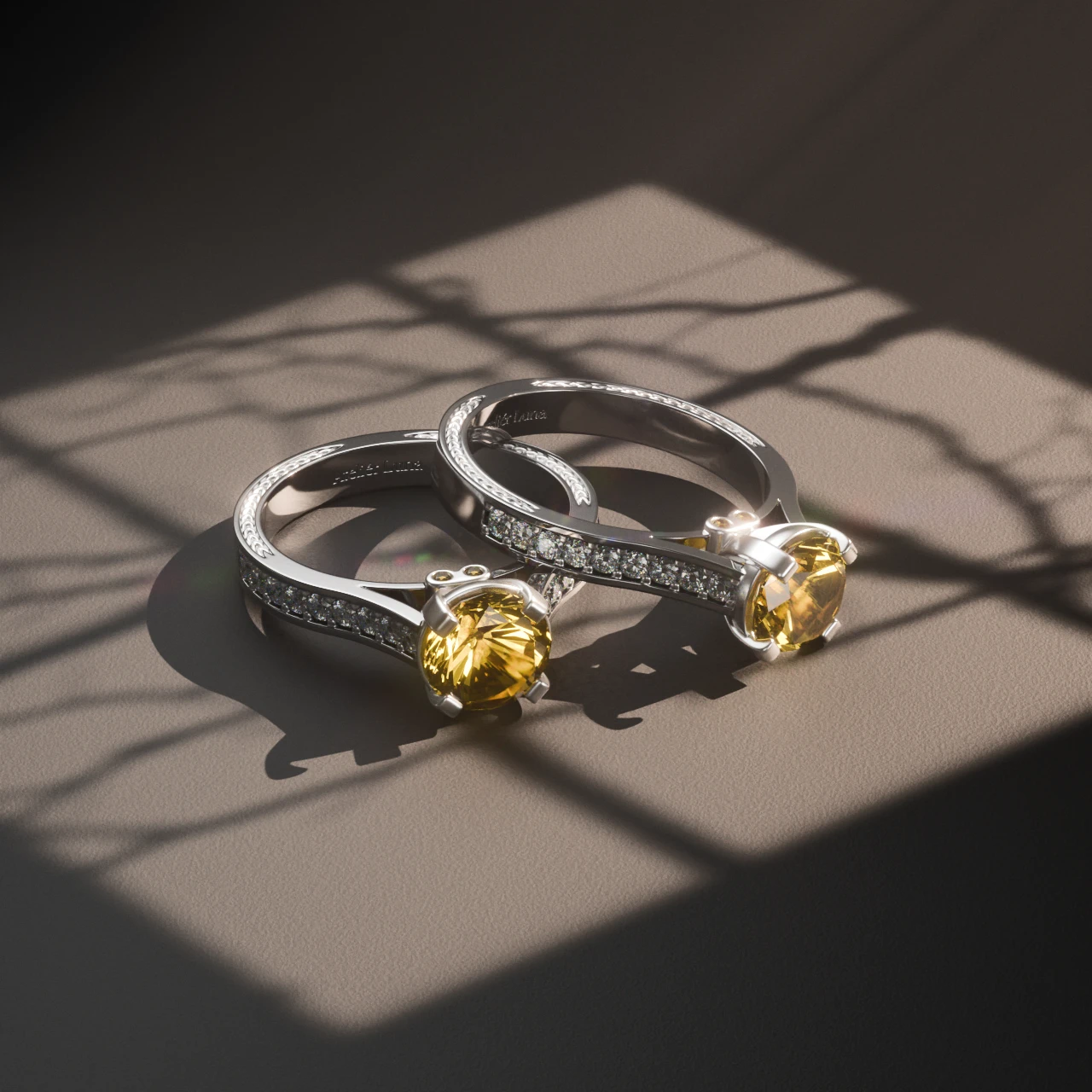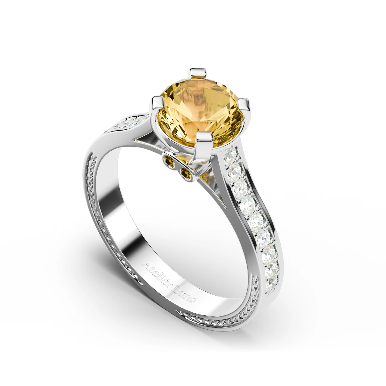 Elegantní stříbrný prsten z dílny Atelier Luna s dominantním citrínem, který v ramenou šperku doplňuje 18 precizně osazených diamantů.