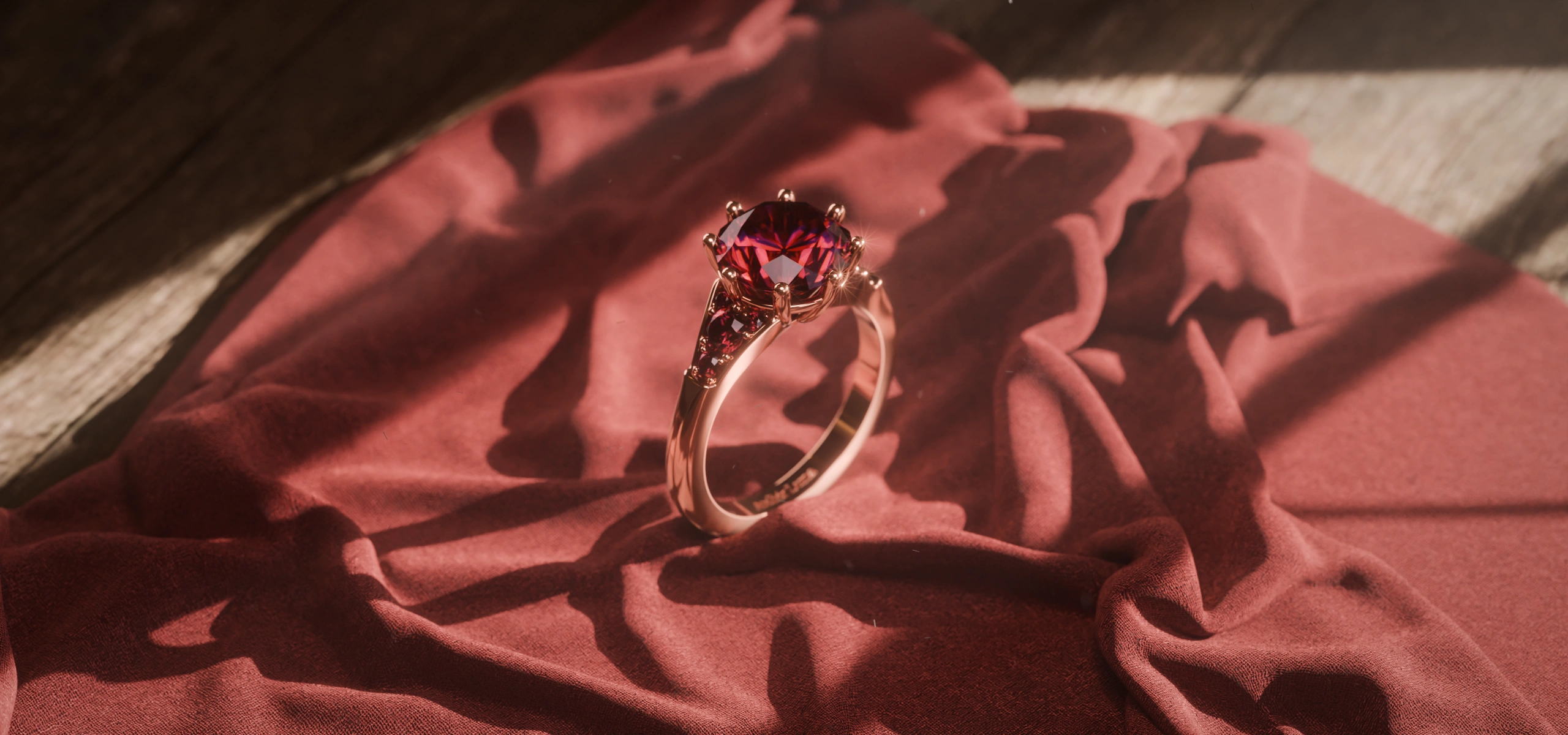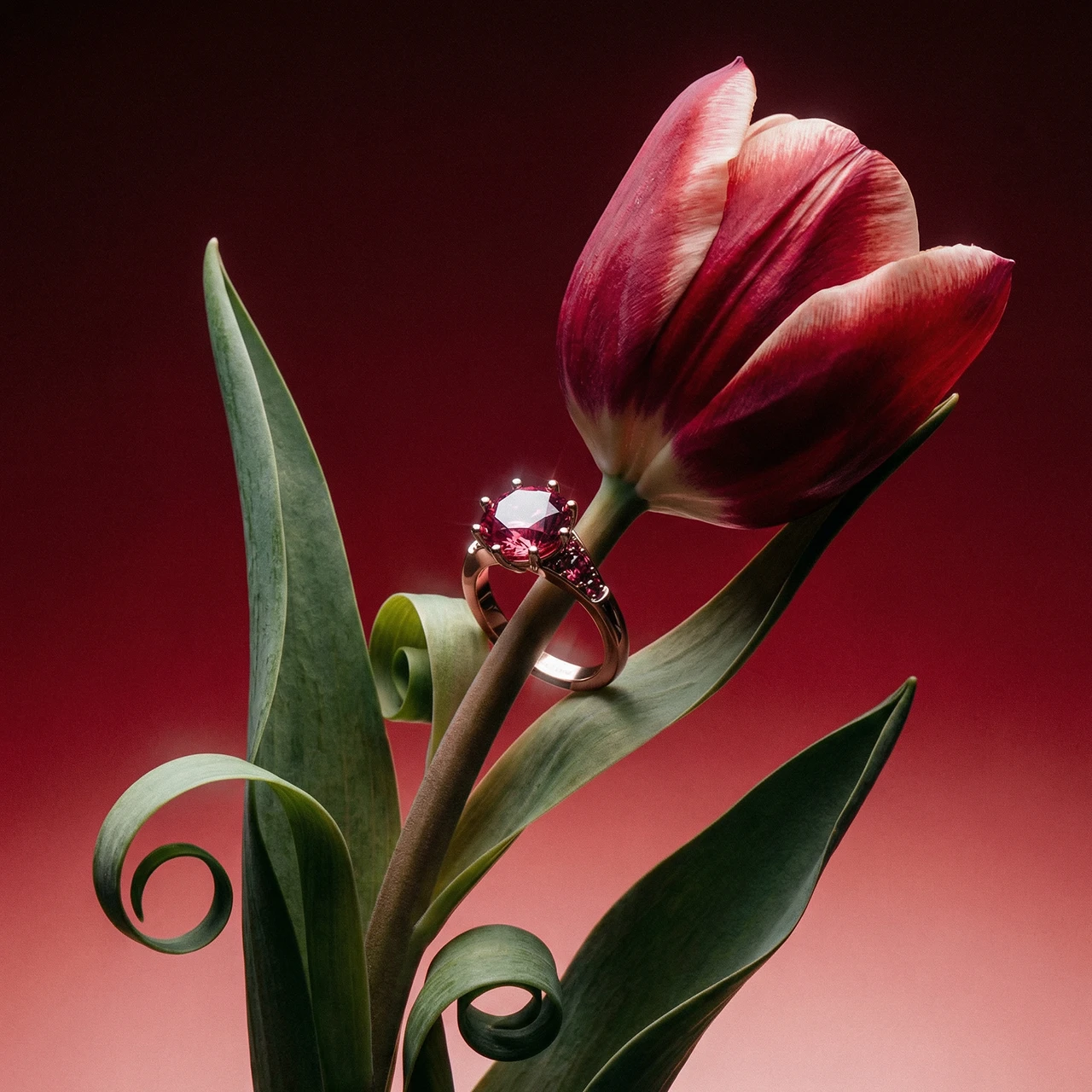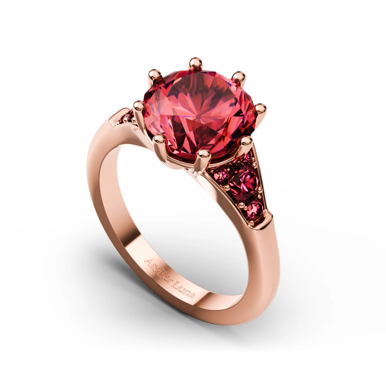 Exkluzivní prsten z 14k růžového zlata z dílny Atelier Luna, kterému dominuje sytě červený rubín podpořený čtyřmi sourozenci z každé strany.